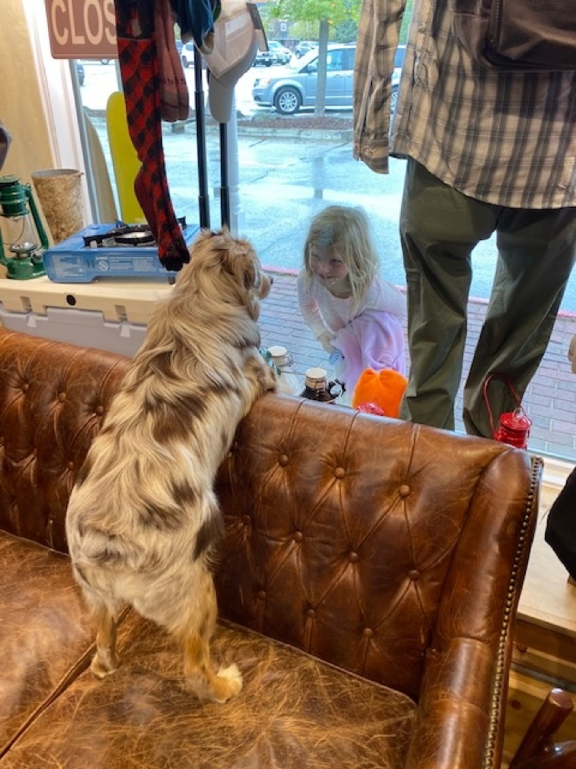 Miss Maple also has lots of children and dogs who pop in to visit, and on these days she is happiest! She will often stare out the window and watch them go all the way to their cars when they are leaving and sometimes even cry a little. It is soooo cute! And because she is a shopdog, she thinks that it is complete normal to get adored 24 hours a day.....This gets challenging when we get home, but that is nothing that a 2 mile walk in the woods or 100 throw's of the ball cant fix!