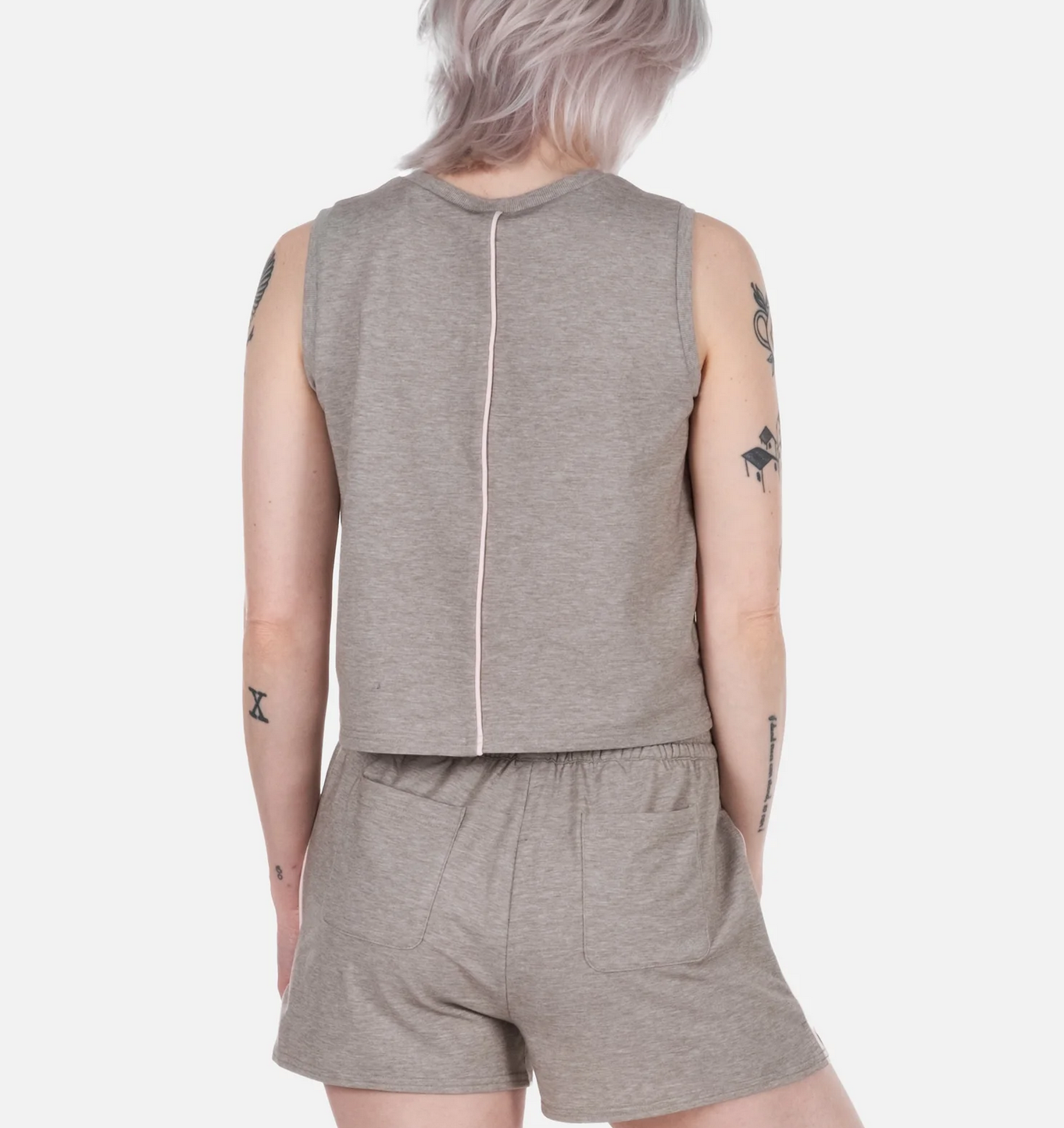 • This summer lounge set will keep you comfy and in a stylish way. The tie color on shorts matches the piping on side of short & back of tank top. An easy breezy set to go forth and enjoy.
