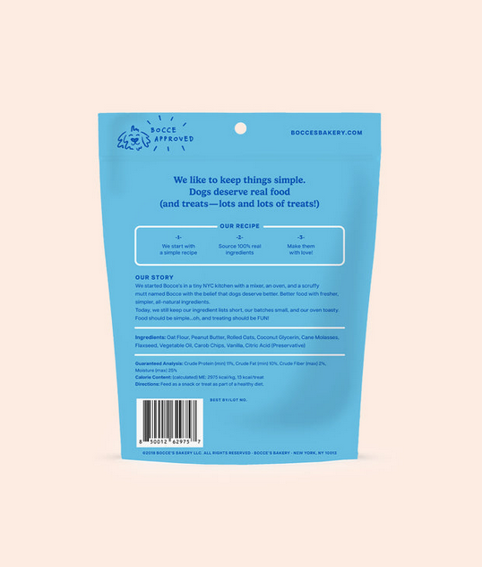 Ingredients:Oat Flour, Peanut Butter, Rolled Oats, Coconut Glycerin, Cane Molasses, Flaxseed, Vegetable Oil, Carob Chips, Vanilla, Citric Acid (Preservative)Guaranteed Analysis:Crude Protein (min): 11%Crude Fat (min): 10%Crude Fiber (max): 2%Moisture (max): 25%Calories:13 kcal/treat