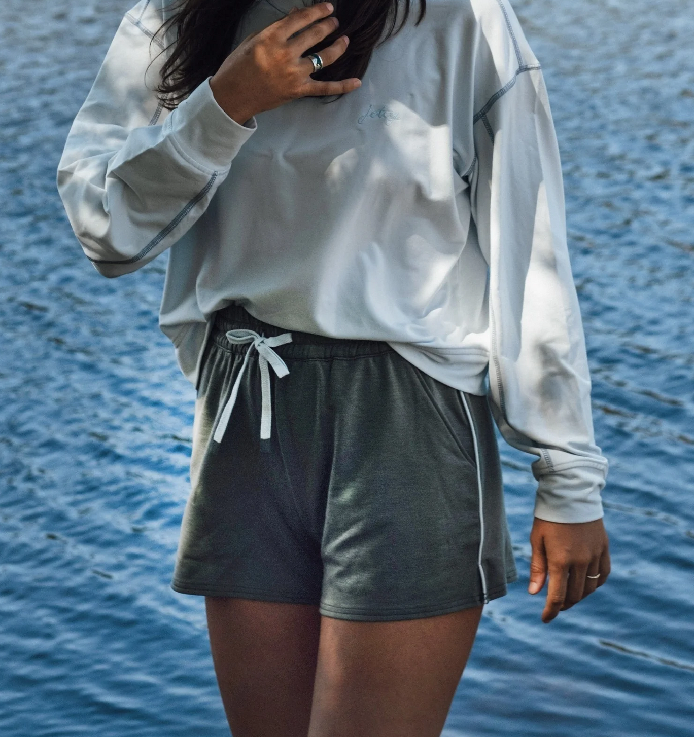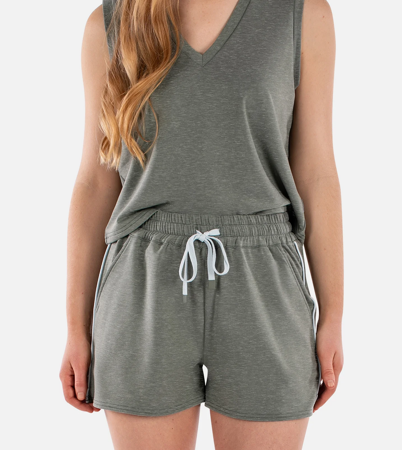 • You will be lounging day after day in this lightweight short. Side pockets, back pockets, and a draw string same color as the piping on side of short. ~ Matches the Bondi V-neck w/ piping down center of back. An effortless way to stylish comfort.