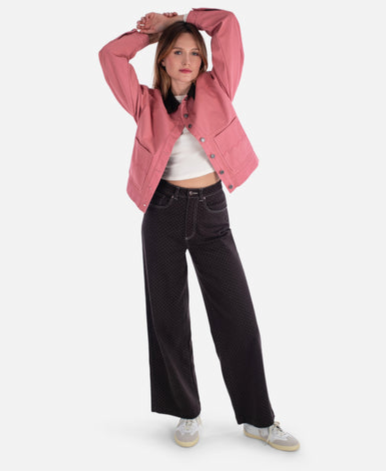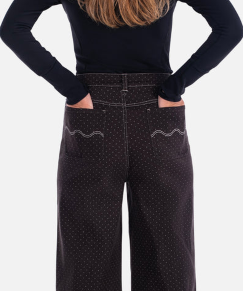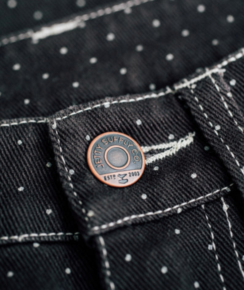 • Make a simple stunning statement in these 99% Cotton, with a hint of stretch (1% Spandex), pants. 5 pocket with custom rivets and a custom Jetty button on the zipper fly. The delicate polkadots add a touch of whimsy. Just enough to give and get smiles.